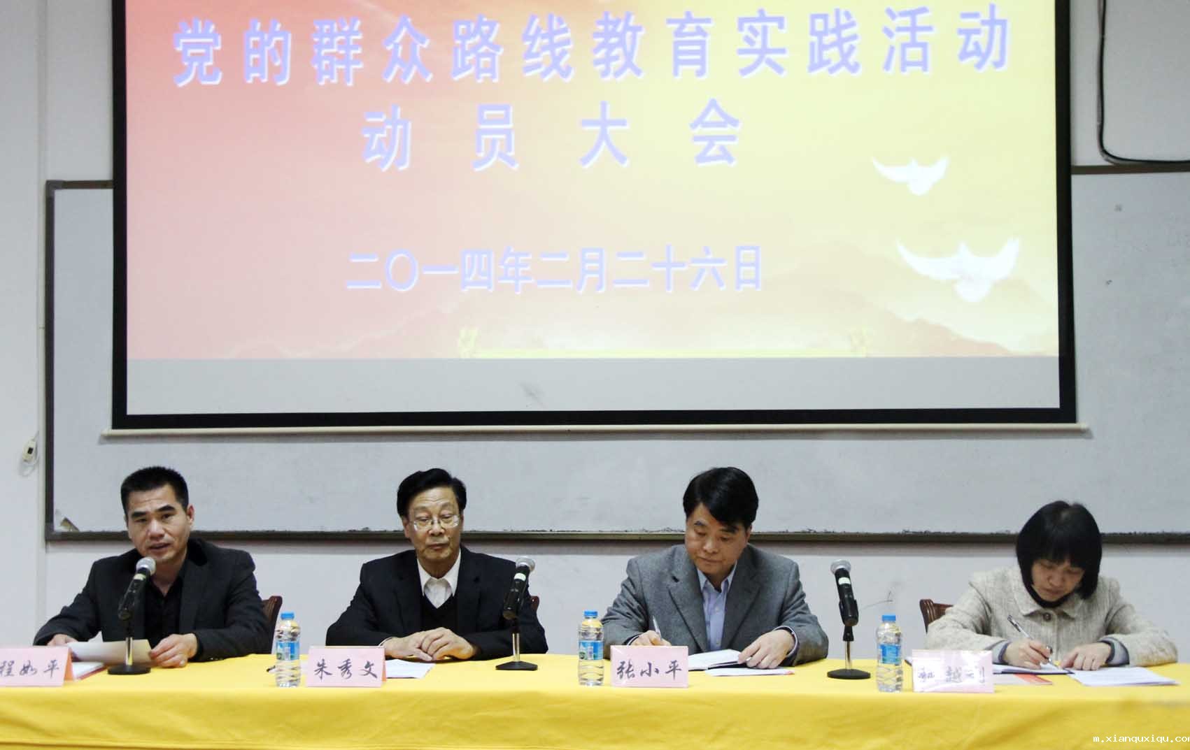 省委第十二督导组组长张小平(右二)、副组长顾越利(右一),校党委副书记朱秀文(左二)、程如平(左一)等参加动员大会