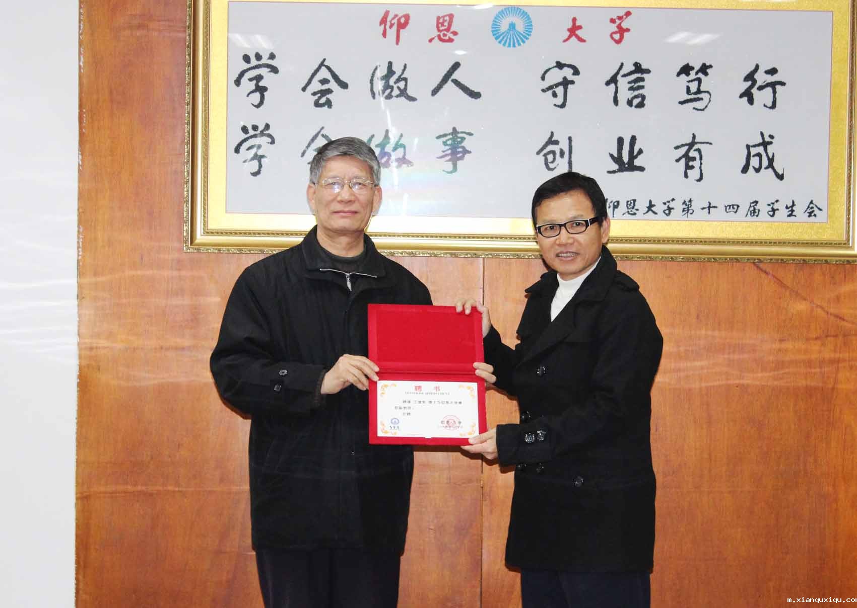 俞正明副校长(左一)为江增常博士(右一)颁发聘书