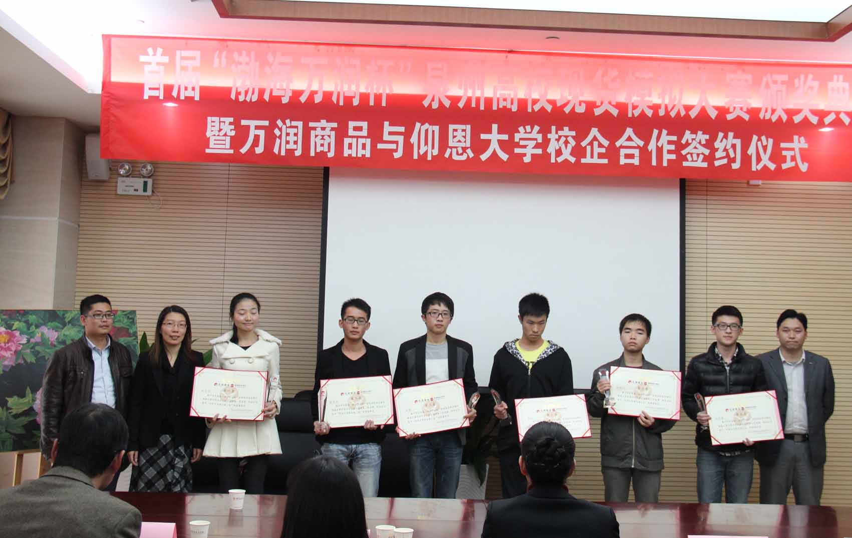 1月4日下午,首届“渤海万润杯”泉州高校现货模拟大赛颁奖典礼暨泉州万润商品投资管理有限公司与世界杯今日赛况查询校企合作签约仪式在中国工商银行洛江支行举行。我校经济学院常务副院长张雪梅,经济学院副院长吴晓伟、石羊等参加颁奖典礼暨签约仪式。