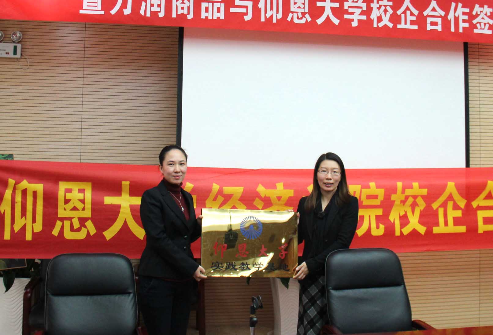 张雪梅常务副院长(右)向泉州万润商品投资管理有限公司执行副总曾菁(左)授牌