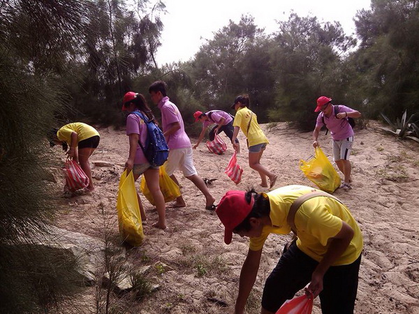 到达目的地后,实践队队员们无暇欣赏身后翠绿秀美的皇帝山和眼前一望无际的蔚蓝大海,他们如征战沙场的战士一般,手提垃圾袋,迅速弯腰“歼敌”,将沙滩上的垃圾纷纷捡起装入袋中。队员何林羽在捡拾玻璃碎片时不慎割伤了手指,她独自做了简单的清理后,又拎起垃圾袋继续前进。轻伤不下火线的精神激励了全体实践队员,他们热情高涨,互相激励,尽自己所能,为还海滩一个美丽原貌而不懈努力。