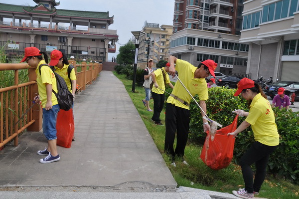 虽然天气酷热,但实践队员们和义工们却始终热情高涨。在泉州义工俱乐部南安分会会长林引兴讲解完活动注意事项后,大家拿着由义工俱乐部分发的夹子、垃圾袋等,在领队的带领下,积极捡拾桃溪沿岸附近路面上的塑料袋、废纸等丢弃物,对河岸处的垃圾也进行了认真清理。大家发扬一不怕脏二不怕苦的精神,不放过每一块纸屑,不留下每一个烟头,经过两个多小时的清扫,整条街道焕然一新。