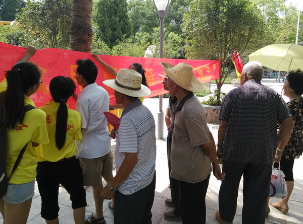 实践队员和路人在横幅上签名