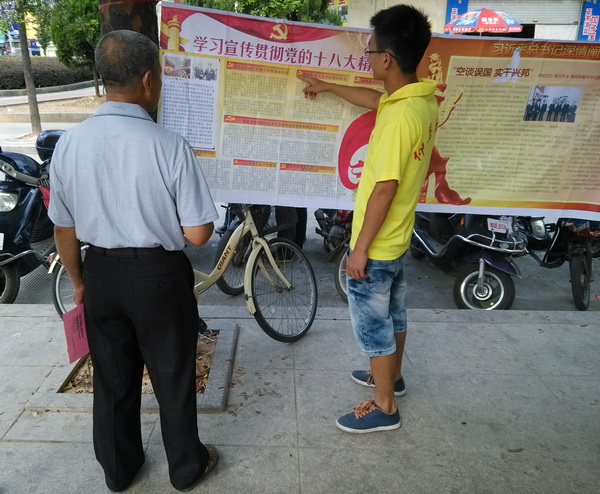 实践队员为路人讲解十八大会议精神