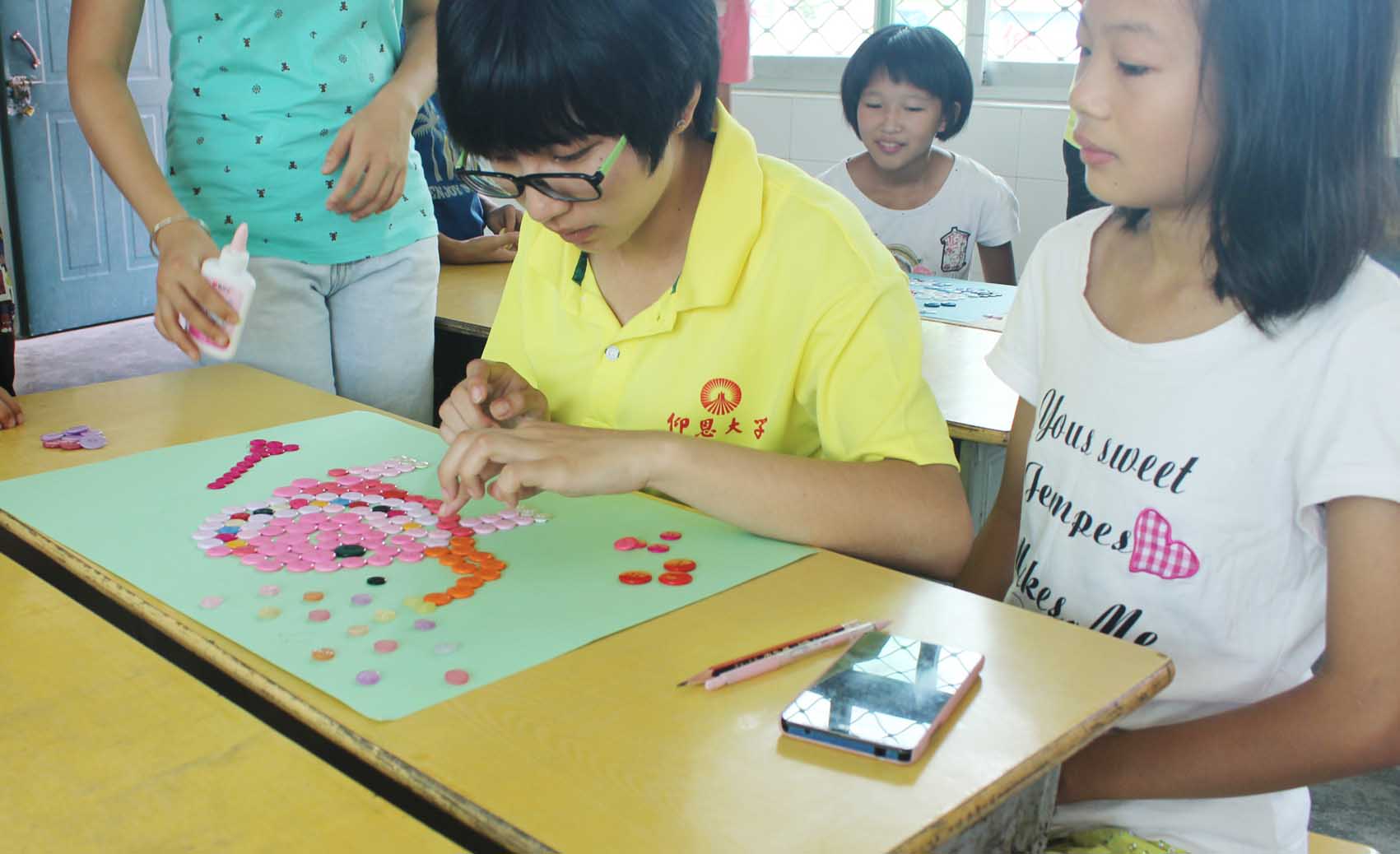 实践队员教小朋友制作纽扣画