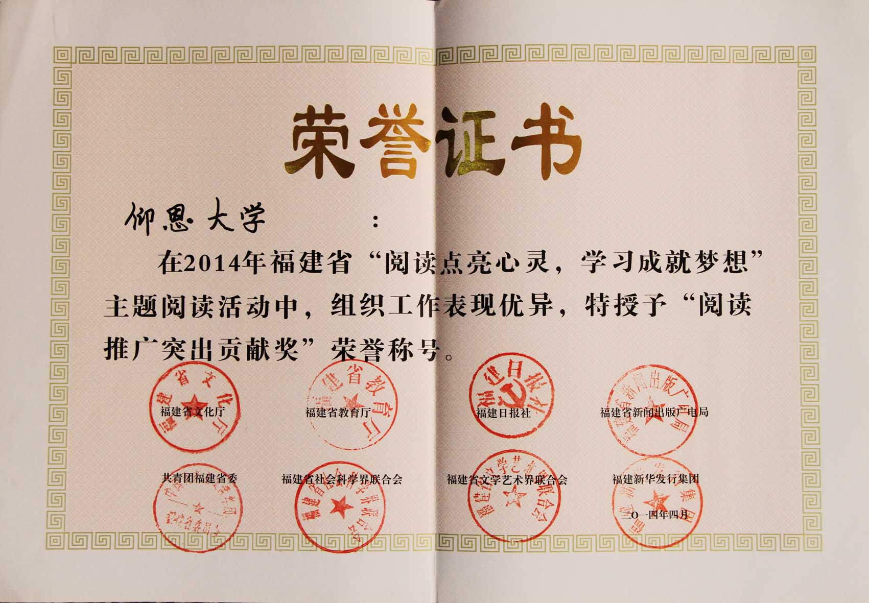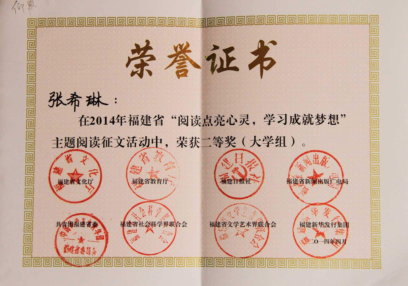 日前,由福建省文化厅、福建省教育厅、福建日报社、福建省新闻出版广电局、共青团福建省委、福建省社会科学界联合会、福建省文学艺术界联合会、福建新华发行集团共同主办,并由福建省图书馆、福建省全民终身教育促进会联合承办的2014福建省“阅读点亮心灵、学习成就梦想”主题征文活动获奖名单正式公布。我校学生张希琳的作品《生如夏花》荣获大学组二等奖。此外我校荣获“阅读推广突出贡献奖”。