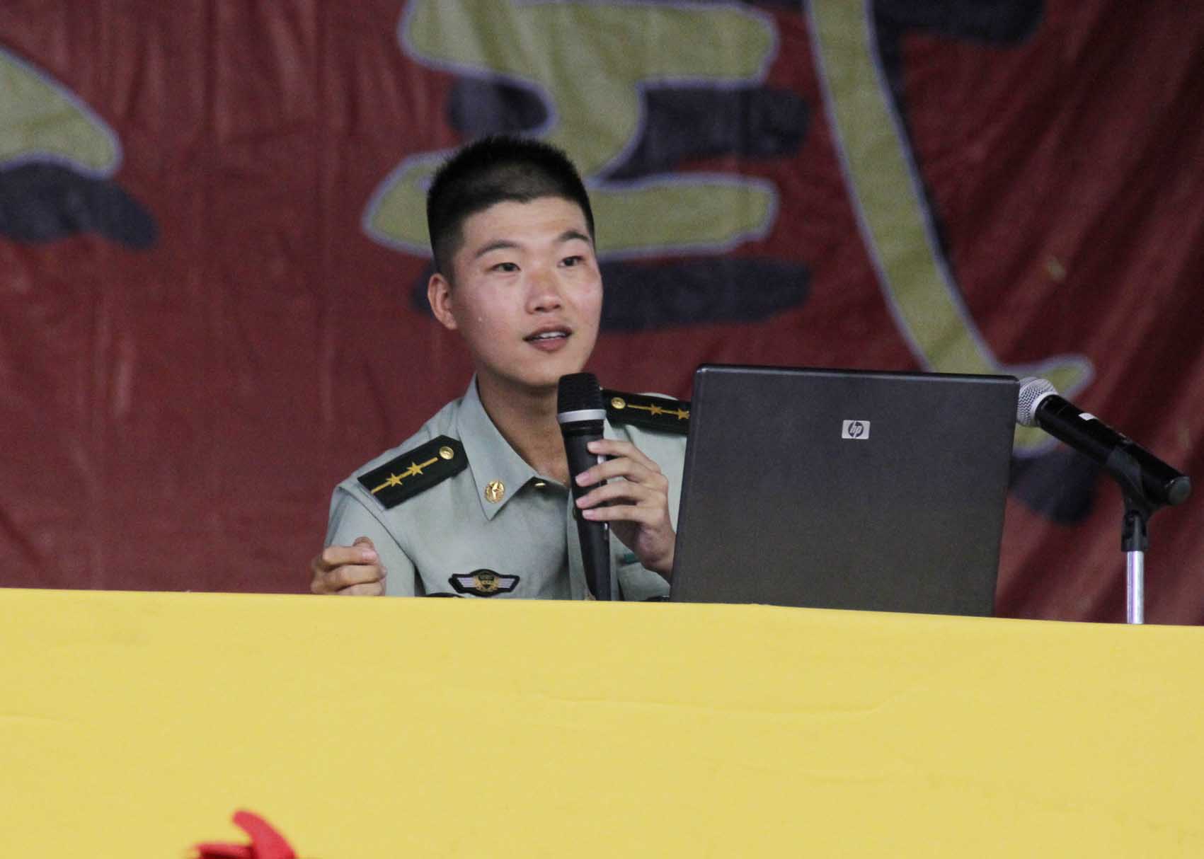 在消防知识讲座中,陈震以别出心裁的方式向同学们介绍了“消防”一词的由来及古今消防的区别、不断精进的消防装备等。他通过图片展示,详细讲解应该如何做好安全应对措施,告诫同学们要注意校园消防安全。