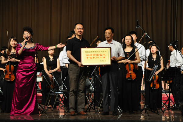 演出结束后,校长朱秀文向福建省歌舞剧院总支书记、福建民乐交响乐交流中心主任叶萌赠送了“演绎高雅艺术、丰富校园生活”牌匾,对乐团精彩的演出表示感谢。(李晓湄、黄建州、陈婉华/文 蔡伟、沈娜、张文薇、蓝妙青/图)