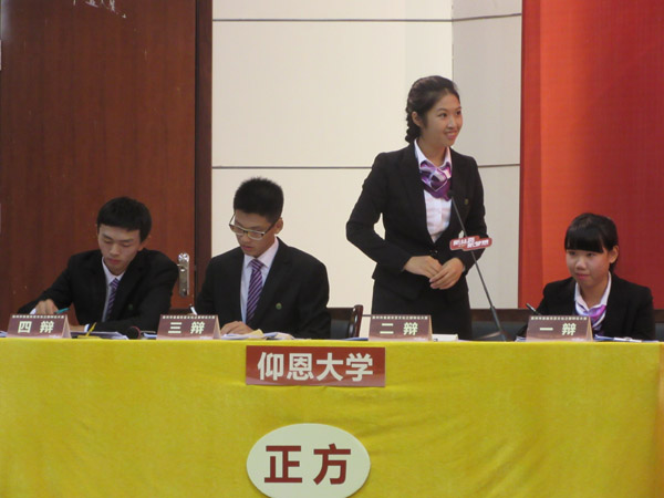 东亚文化之都辩论大赛自4月份启动以来,共有6所高校8支代表队和7个市(驻泉)单位报名参加辩论赛。首场辩论赛烽火在我校辩论队与福师大闽南科技学院辩论队之间点燃,他们围绕着“面对‘一带一路’建设,泉州机遇大于挑战还是挑战大于机遇”展开论战。正反双方紧扣己方观点,举证到位,语言幽默犀利,互有攻防。我校辩手言辞练达,观点深入精辟,激辩中不失稳重理性,展现出仰恩学子过硬的知识水准以及良好的心理素质和思辨能力。