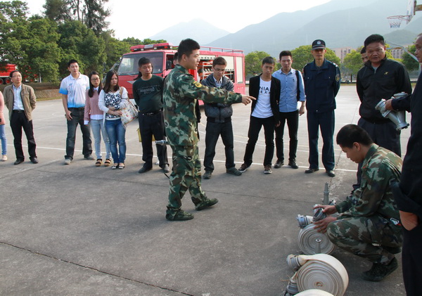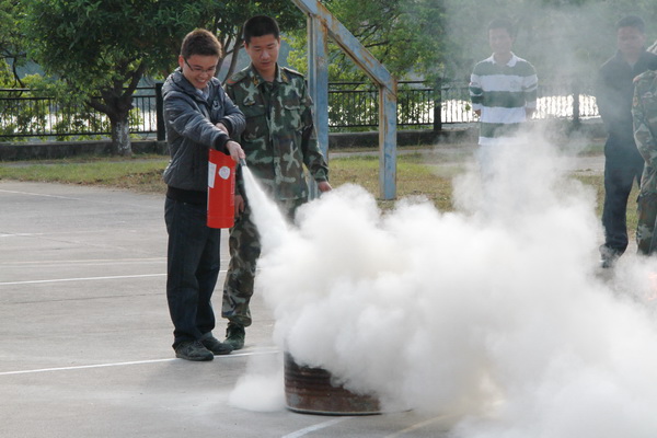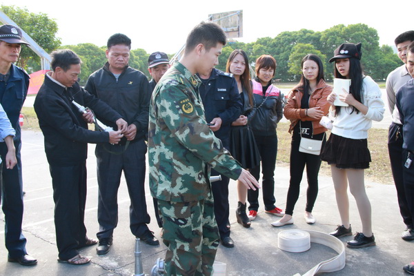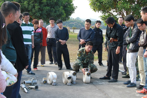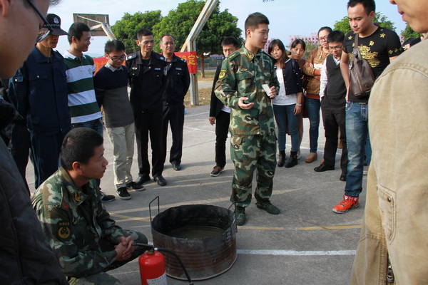 马甲消防中队教官向我校义务消防员讲解手提式干粉灭火器的使用方法