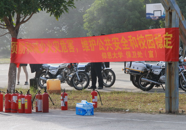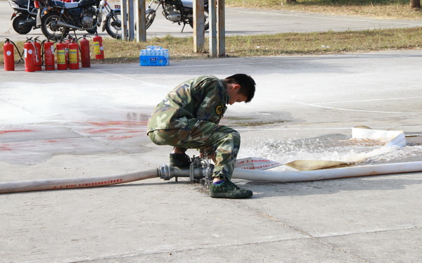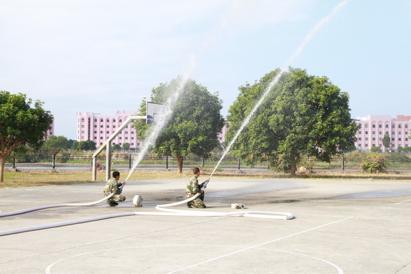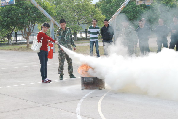 培训现场,马甲消防中队教官详细讲解了手提式干粉灭火器、消防水带和高压水枪的使用办法及注意事项,演示并现场指导参训教工使用灭火器对模拟火灾进行扑救。学校保安人员则演练了室外消防器材的使用程序。