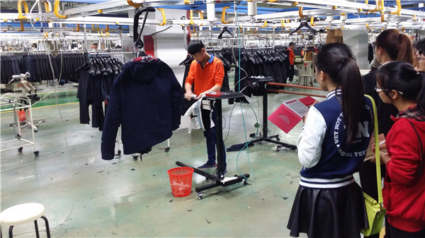 园区工作人员热情接待了我校会计学院师生,并带领大家参观了该园区西服裁剪车间、生产车间、整烫车间、整套车间、西服茄克藏存区以及高达27米的立体库区。