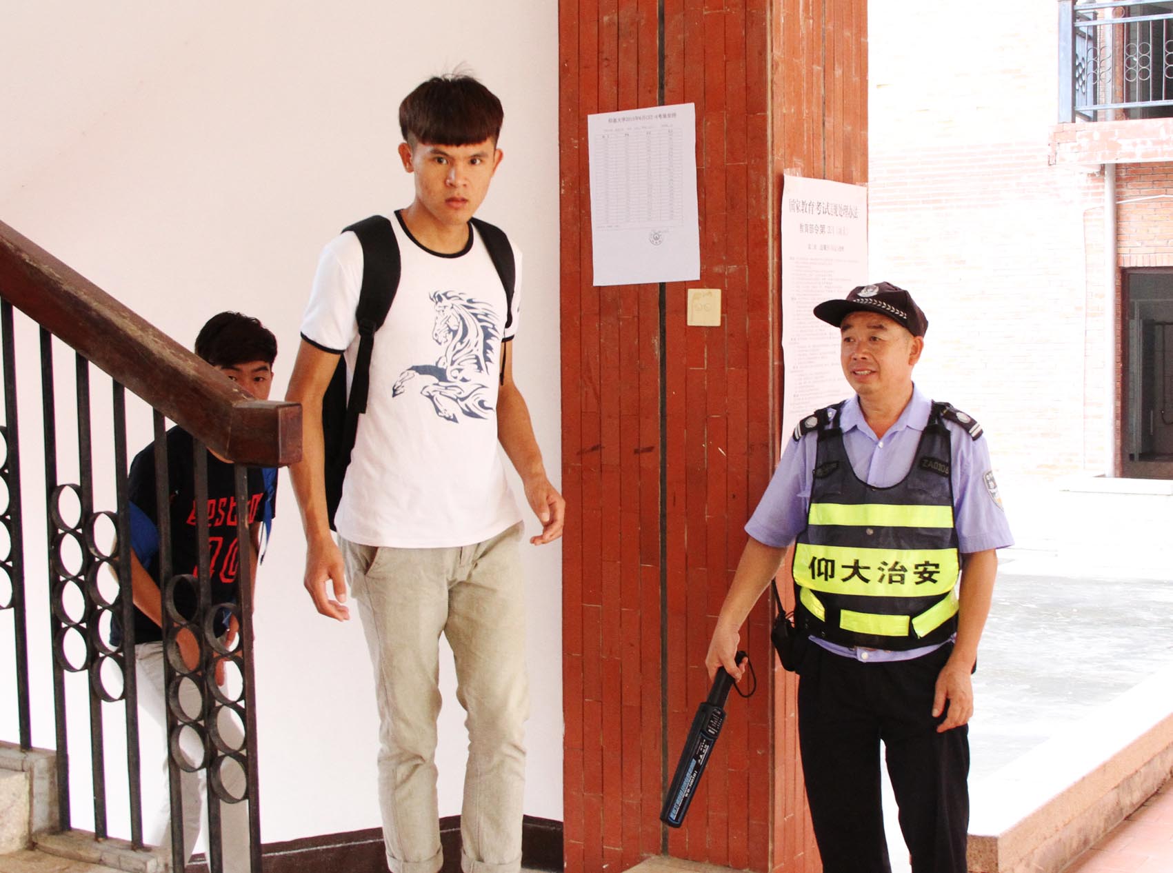 学校安保人员对入场考生进行金属探测扫描
