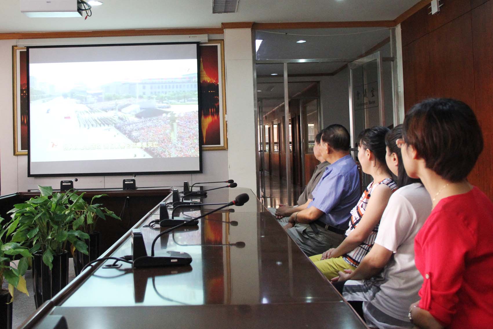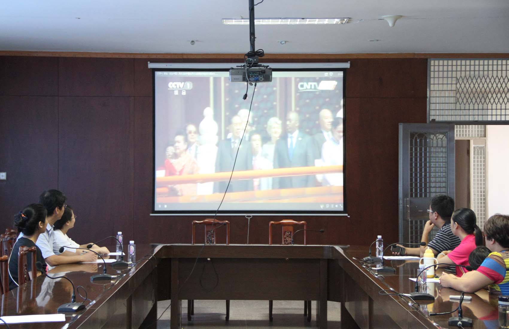 行政部门工作人员在第一教学区行政楼会议室观看视频直播