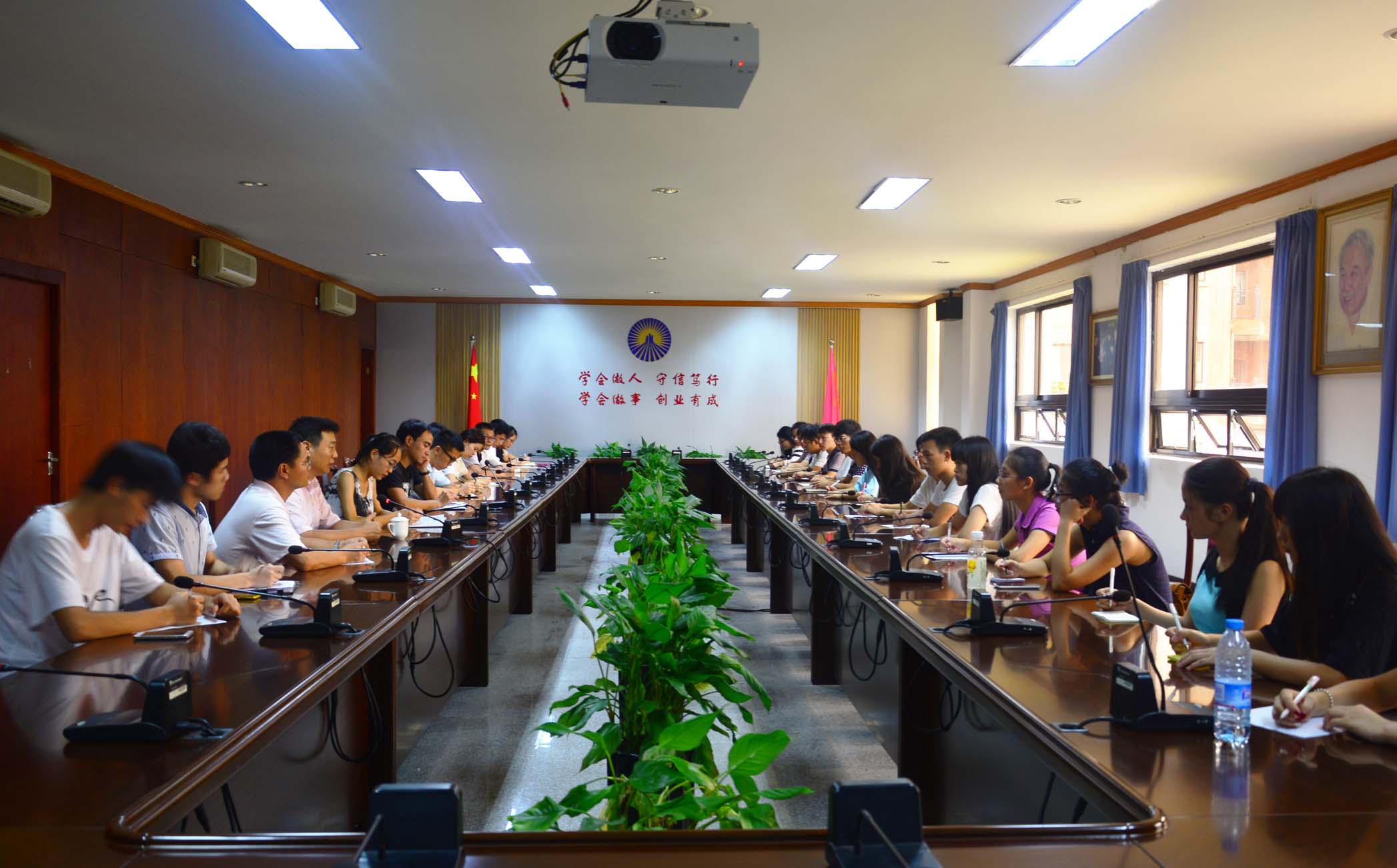 教职工在第三教学区行政楼会议室观看视频直播