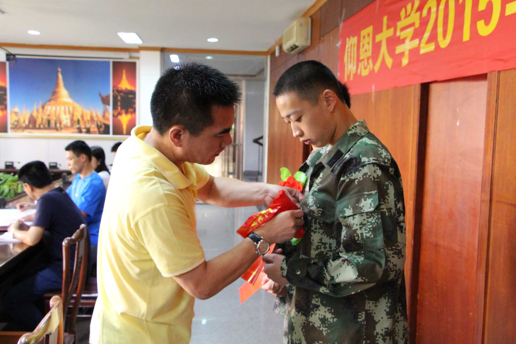程如平副书记(左)为入伍学生佩戴大红花