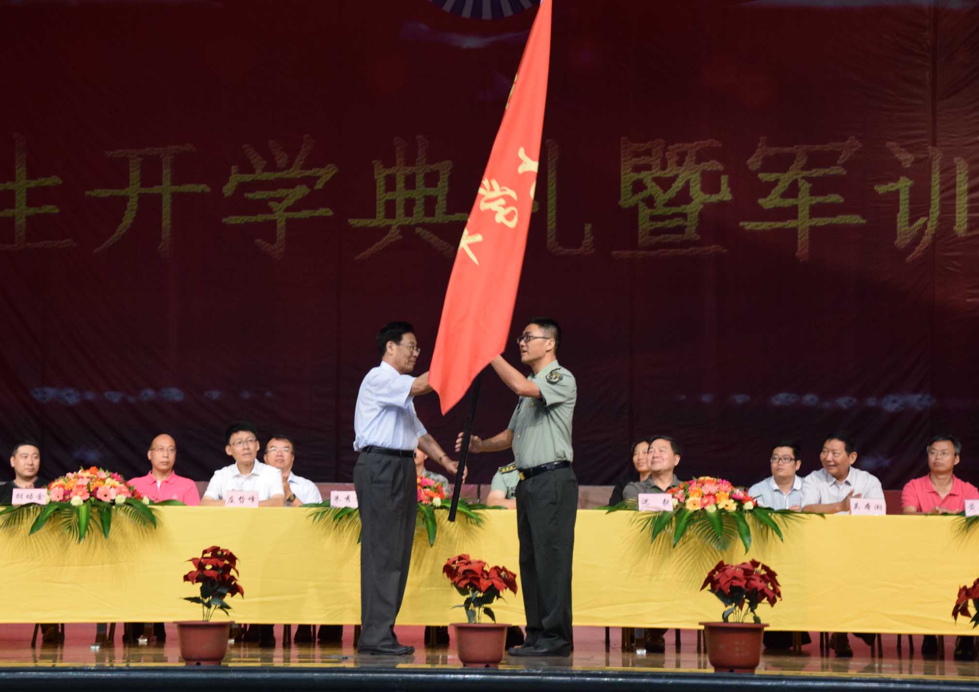 大会最后,朱秀文校长代表学校向73142部队军训团授军训团旗,正式委托承训部队官兵对我校新生进行军事训练。开学典礼暨军训动员大会在热烈的掌声中圆满落下帷幕。(俞晶颖、林丽芹/文 林鸿、陈方玲、王丽桑/图)