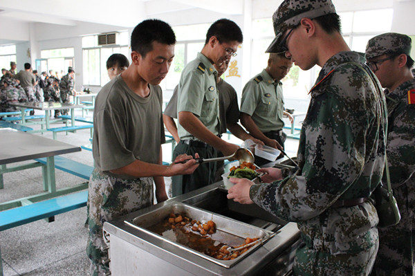中午时分,行军队伍抵达部队驻地。部队首长夏桂军、王向东在门口迎接行军队伍的到来,对新生们吃苦耐劳的精神大为赞叹,并为师生们准备了可口的午餐,帮助大家补充体力。同学们遵循部队的规定,在用餐前高声歌唱军歌,排队用餐。用餐时,不讲话,不出声,整个食堂井然有序。