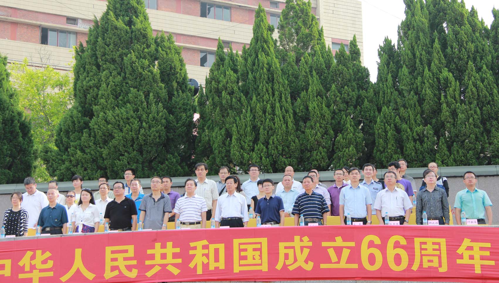 在祖国66周年华诞之际,10月1日上午,我校在第一教学区仰恩基金会体育场隆重举行庆国庆升国旗仪式。校领导朱秀文、庄哲峰、沈毅、程如平、吴本湘、许总、黄小铭、石羊、鲍莹玉,各院系、部门负责人,外籍教师代表,广大师生参加了升旗仪式。