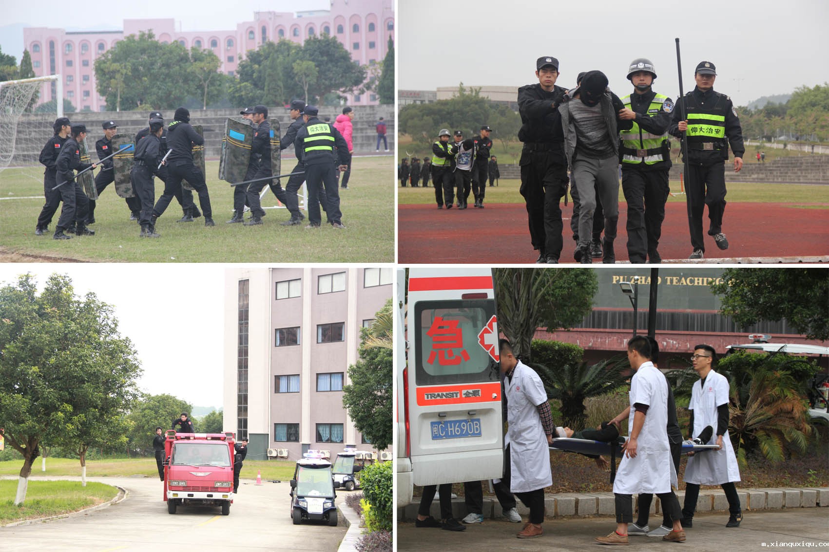 来自洛江公安分局、马甲派出所的民警,洛江区医院的医务人员以及我校的四百余名师生参加了演练。整个演练调度指挥到位,过程井然有序,线上舆论导控及时有效,学校安保力量配合公安特警、消防人员和医护人员按照演练要求,共同完成了各项指定要求,成功擒获“暴徒”,扑灭火灾,解救了受袭师生。