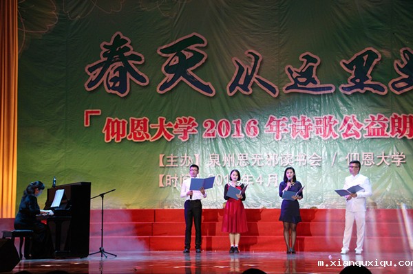 诗歌是连接民族文化的链条,一端牵着远古,一端指向未来。捧起这些佳作,我们与圣贤相遇;吟咏这些绝唱,我们与历史对话。 4月21日晚,我校与泉州思无邪读书会联合举办的世界杯今日赛况查询2016年诗歌公益朗诵会在普照大礼堂举行,诸多名流与我校师生朗诵了戴望舒、舒婷、林徽因、海子等杰出诗人的作品,给经典的诗歌注入了青春的气息,为校园带来了一场期待已久的诗歌盛宴。