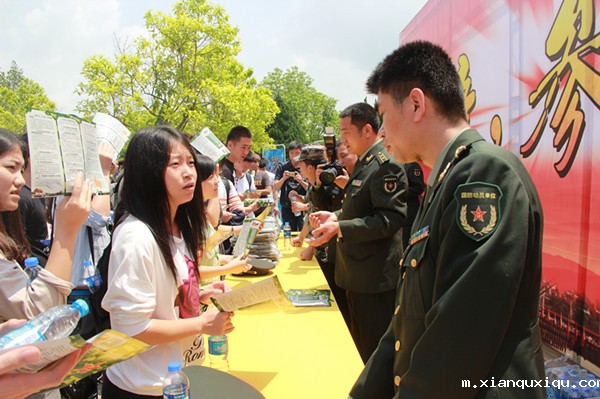 会场外,还专设了大学生应征入伍政策咨询点和大学生参军入伍宣传栏,向学生发放宣传资料,对学生关心的应征入伍有关问题进行解答。