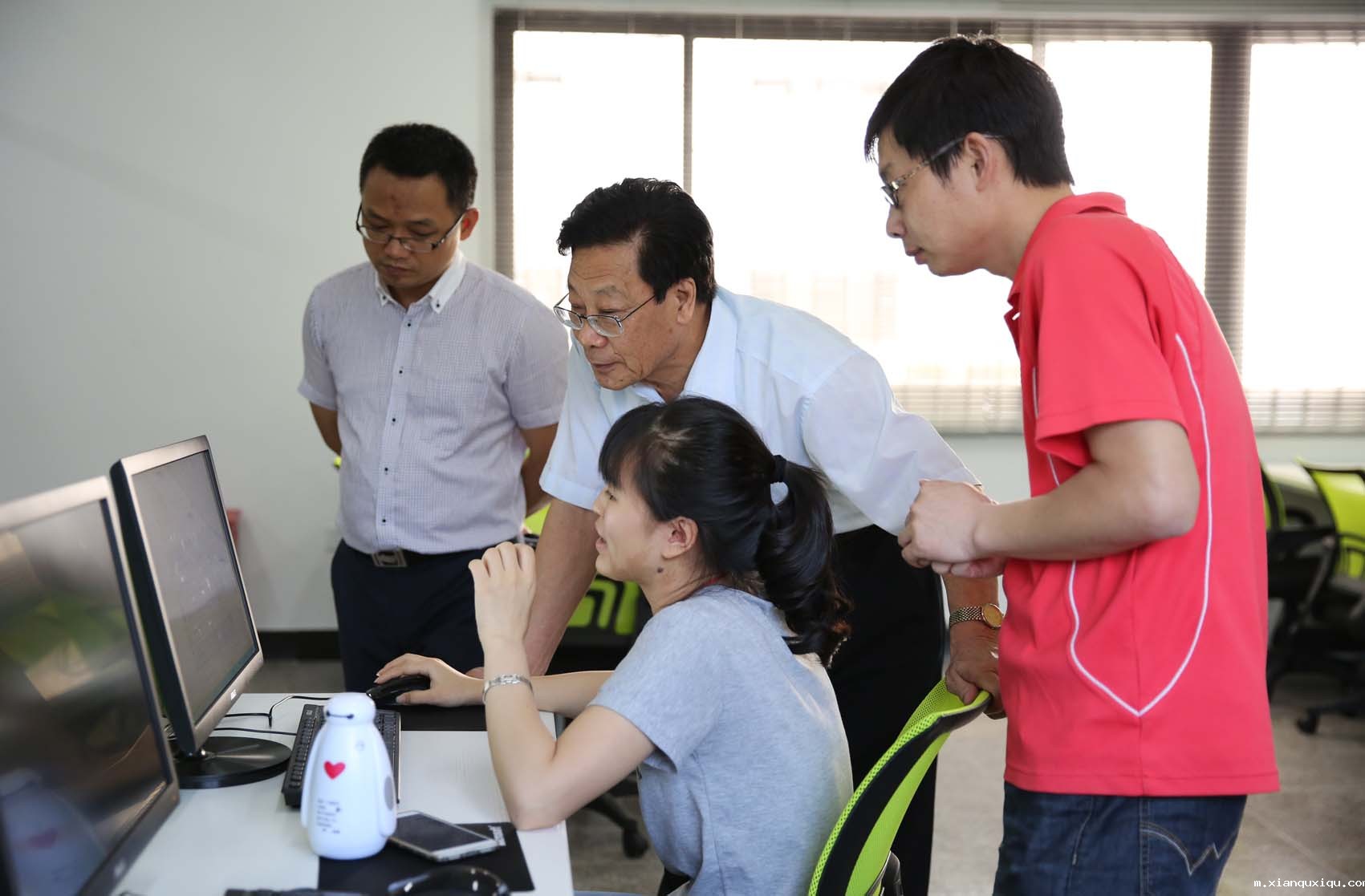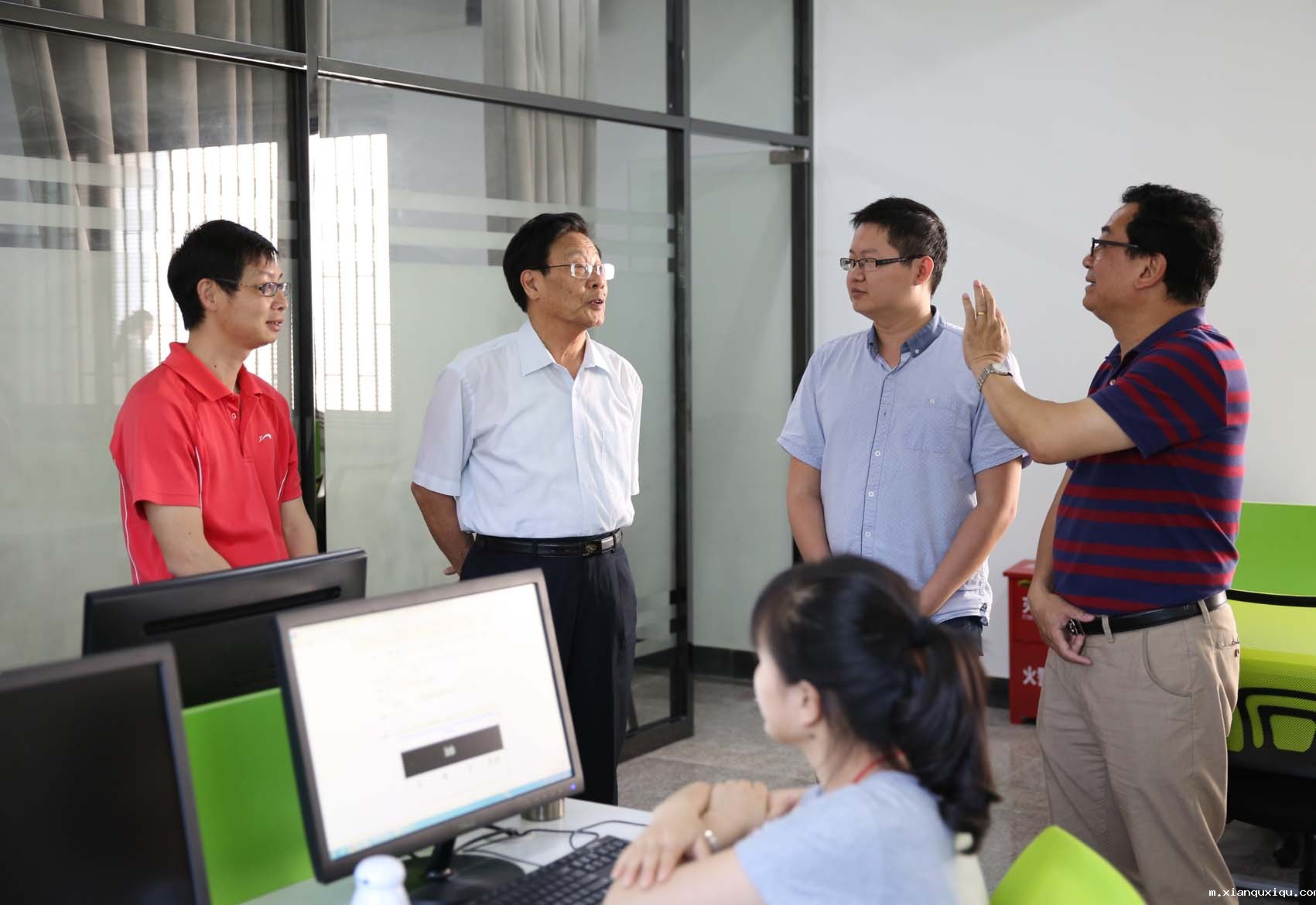 朱秀文校长(左二)听取副校长、产业园管委会主任黄小铭(右一)的汇报