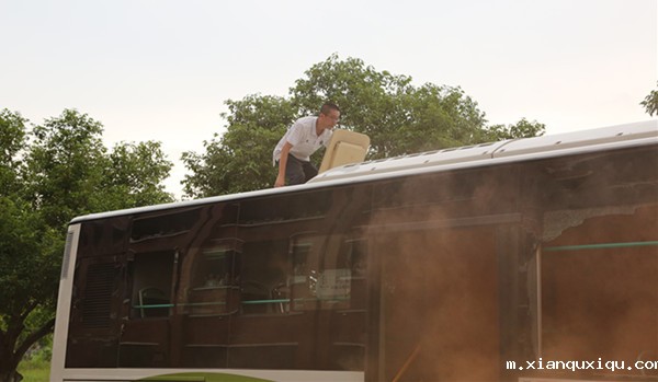 介绍完基本常识后,公交车火灾应急逃生实战演练正式拉开帷幕。在浓烟滚滚中,参加演练的师生有的利用前后门逃生,有的利用救生锤敲碎车窗而出,有的从车顶的天窗爬出,也有的利用车上的灭火器进行自救。消防人员及时赶到现场进行灭火。整个演练过程紧张激烈、规范有序。