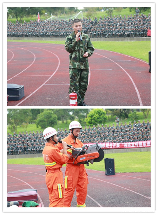 消防应急疏散演练结束后,马甲消防中队官兵在军训体育场为全体受训学生进行了消防器材展示,详细介绍了金属切割器、空气呼吸器、消防救援服、干粉灭火器等消防器材的使用方法,以及消防安全知识。在消防队员手把手教授下,受训学生纷纷上前亲手体验灭火器的使用,并对熊熊燃烧的火盆进行了灭火实践。