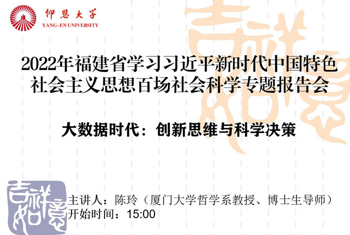 根据《中共福建省委宣传部 福建省社会科学界联合会关于举办2022年福建省学习习近平新时代中国特色社会主义思想百场社会科学专题报告会的通知》文件要求,12月7日下午,科研处组织开展2022年福建省学习习近平新时代中国特色社会主义思想百场社会科学专题报告会,福建省百场社会科学专题报告会主讲人、厦门大学哲学系博士生导师陈玲教授线上为师生作《大数据时代:创新思维与科学决策》专题报告。