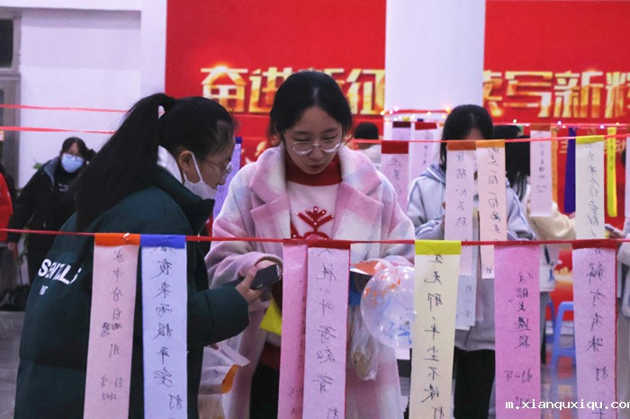 在图书馆大厅的灯谜竞猜现场,五彩缤纷的谜笺交相辉映。党的二十大知识、成语谜、地名谜、书刊诗词谜等4000余条灯谜谜面成排地披着,内容着重突出人文性和趣味性,引来了许多师生驻足。师生们发挥聪明才智,纷纷竞猜,重温和拓展灯谜知识的同时也收获了各类讨喜的奖品。