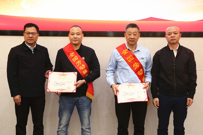 林东阳(右一)、黄克航(左一)为李小平、侯国建颁发了2023年劳模(工匠)宣讲员证书