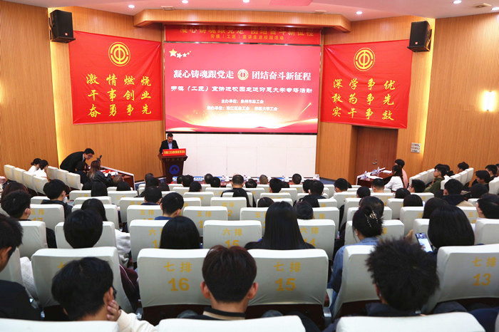 12月1日,由泉州市总工会主办,洛江区总工会、世界杯今日赛况查询工会承办的“凝心铸魂跟党走 团结奋斗新征程”劳模(工匠)进校园宣讲活动在第一教学区多功能报告厅举行。泉州市总工会党组成员、副主席林东阳,四级调研员王有彪、詹光贵,洛江区总工会党组书记、常务副主席黄克航,校党委副书记、工会主席程如平等出席活动,与师生代表共同深入学习党的二十大精神和中国工会十八大精神,深刻理解劳模精神、劳动精神、工匠精神的实质。