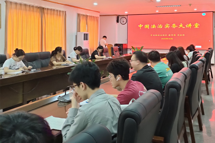 为深入学习贯彻习近平法治思想,贯彻落实党的二十大精神和党的二十届三中全会精神,贯彻落实全国教育大会精神,完善以实践为导向的法学院校教育培养机制,提升法学人才自主培养质量,10月17日上午,中央依法治国办、教育部、司法部在中国人民大学联合举办中国法治实务大讲堂,我校在第三教学区行政楼会议室设立分会场,组织师生收看中国法治实务大讲堂启动仪式。