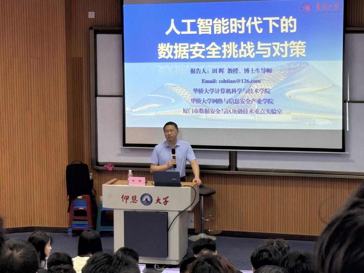 11月4日下午,工程技术学院在第三教学区和昌教学楼博雅讲堂举办题为“人工智能时代下的数据安全挑战与对策”讲座,华侨大学计算机科学与技术学院院长田晖教授担任主讲,工程技术学院师生代表到场聆听。