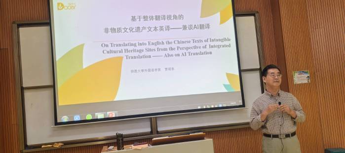 讲座中,贾绍东以“基于翻译整体理论视角的非物质文化遗产文本英译——兼谈AI翻译”为题,从非遗的概念、文本特征、翻译理论及原则、翻译策略和技巧等多个方面进行讲授。他强调,AI翻译技术能极大地提高翻译效率,但它不是万能的,仍具有一定的局限性,这就要求译者要具备比AI翻译更高的翻译水平,才能解决翻译中的难题,才能确保译文的质量,才能保留译文中文化原汁原味,以促进非物质文化遗产的国际传播。
