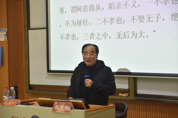 讲座中,张国安以“孝道与法文化”为题,从孝道与法律结合之演进轨迹、孝道与传统立法、孝道与传统司法以及孝道法文化对当代的启示四个方面,进行全面的解读与剖析,讲述了孝道即为传统立法之核心价值、亦为传统司法之核心价值。他强调,孝道作为中国传统文化的重要组成部分,尊敬长辈、关爱家人,是维系家庭和谐、社会稳定的重要纽带。在现代社会中,孝行不仅应基于道德自觉,还应符合法律法规。我国通过法律的形式将孝道法文化用于中国人的日用常行中,将孝道法文化一脉相承。