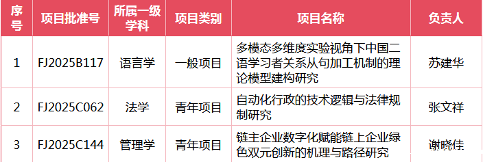 近日,福建省社会科学规划办公室公布了2025年度福建省社会科学基金项目立项名单,我校3项课题获项目立项,其中一般项目1项、青年项目2项。
