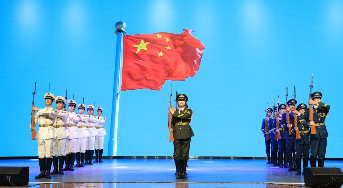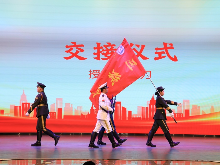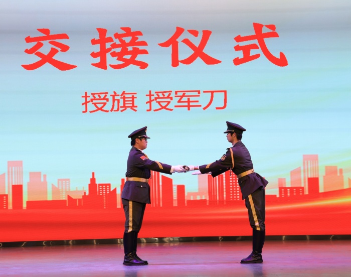交接大会在雄壮的国歌声中拉开序幕。全体与会人员肃立,齐声高唱《中华人民共和国国歌》。