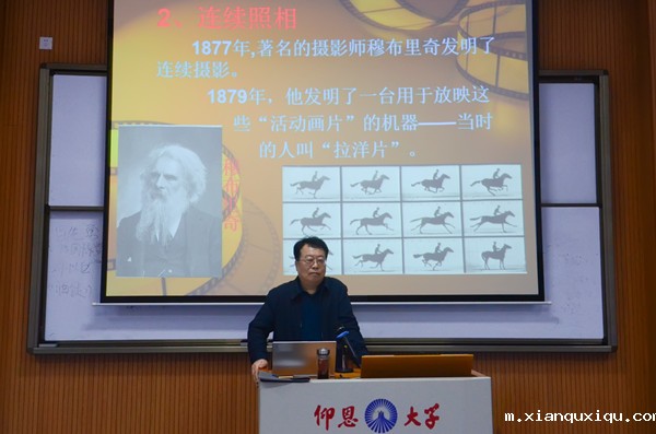 “电影是一门讲故事的叙事艺术,是一门代言体艺术。” 魏杨青以同学们熟知的电影为例,分析其艺术特色,增强他们的电影审美意识。他讲述了世界电影的发展脉络,从照相机、连续照相、摄像机等发明,到卢米埃尔兄弟、梅里爱、卓别林等大师的电影时代,再到有声电影、彩色电影的发展等,他用幽默通俗的语言,介绍了不同阶段电影的发展特色,让同学们深刻认识到了电影的发展历程和独特的艺术魅力。
