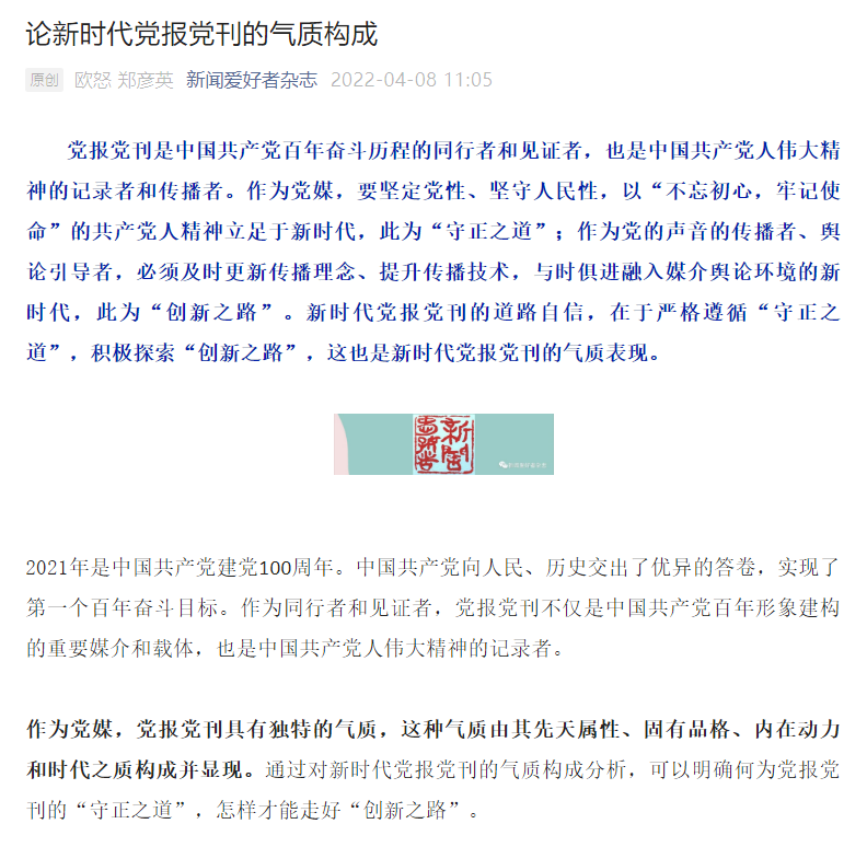 《论新时代党报党刊的气质构成》发表在《新闻爱好者》2022年第三期