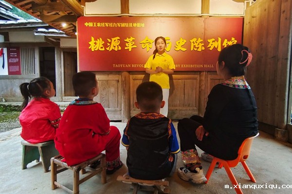 此外,实践队员们担任青年志愿者,为来到村中研学的中小学学生队伍讲述村中的历史故事、红色故事。通过队员们声情并茂的讲述,学生们了解了红军三过桃源村的故事、浮桥头战斗的始末、风水隔七烈士墓的由来。
