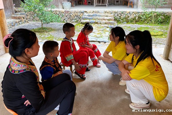 实践队队员们带领东坂村畲族小孩来到红军旧址——福裕堂,围坐在厅堂中,认真倾听实践队员讲述《朱德的扁担》《中共一大的召开》等红色故事,孩子们听得津津有味,并与实践队员积极互动。